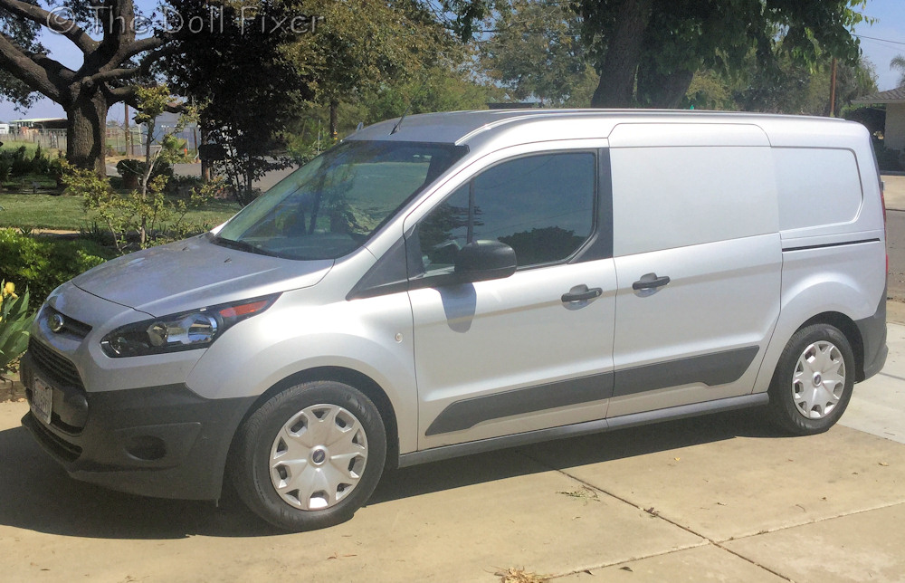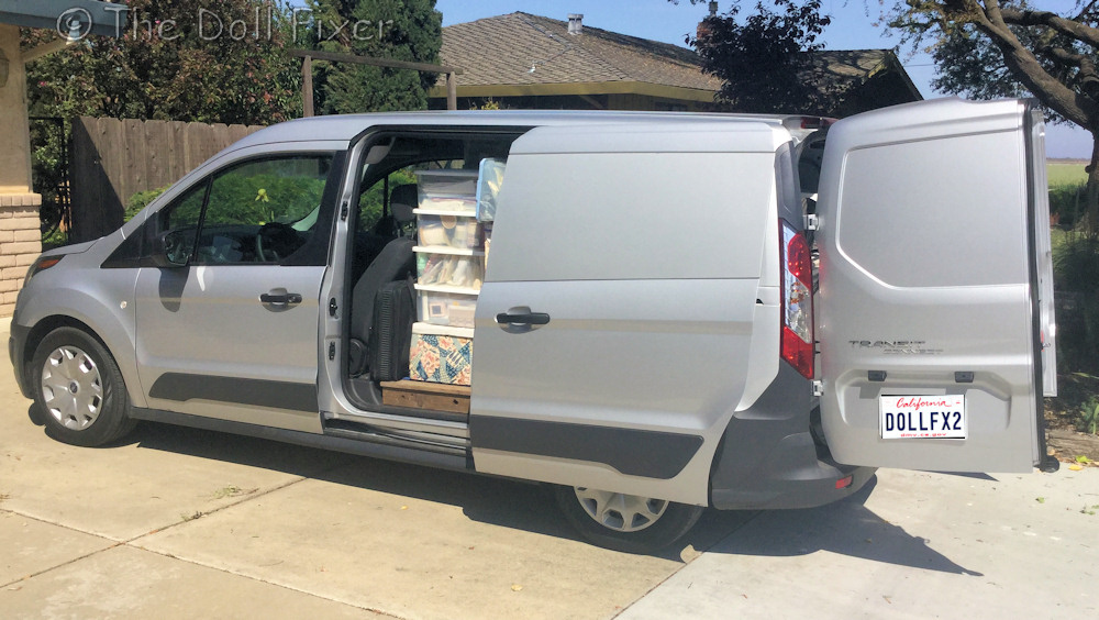 For those of you who may have been looking for me at the shows and were missing the doll fixer mobile I wanted to let you know I have a new van for the show transport. My Volvo was nice and has a lot of room but it was not quite big enough for the shows, To get everything we needed we had to pack stuff on the roof and pack every square inch in the back. For bigger shows we had to pull the trailer which was a pain. I now have a very nice Ford Transit Connect Van which can take all the show merchandise with ease. No more trailer Yeah. I was able to get the van in a nice silver color instead of the oh so common white.
